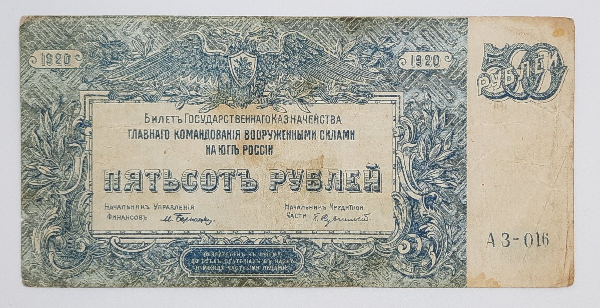 1920 Russia, High Command of the Armed Forces (South Russia) - 500 Russian Rubles Banknote Serial A3-016 P-S434