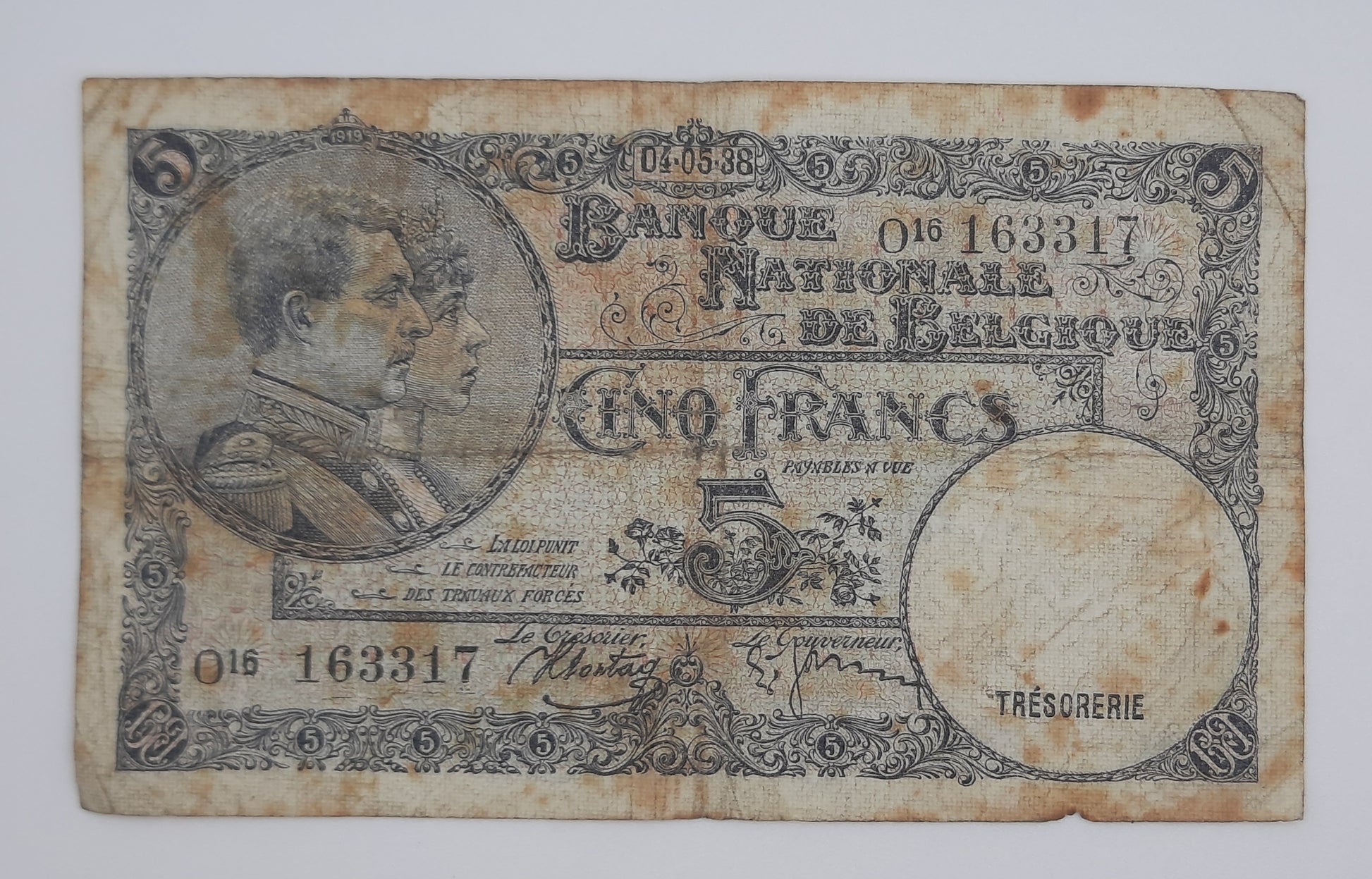 1938 Belgium, Banque Nationale Belgique - 5 (Five) Belgian Francs Banknote Serial No. O16 163317 P-108a