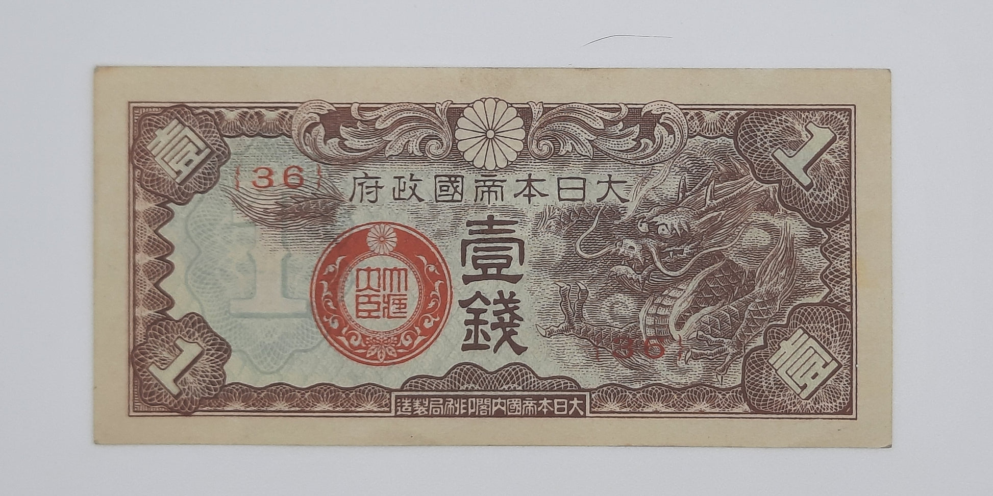 Obverse: Printed in brown ink over a blue-gray underprint, the note features a stylized dragon on the right—a symbol of imperial power—and a red seal on the left. The inscriptions are in classical Chinese script, including “大日本帝國政府” (Government of the Empire of Japan) and “壹銭” (One Sen), with production credited to the Printing Bureau of the Empire of Japan.