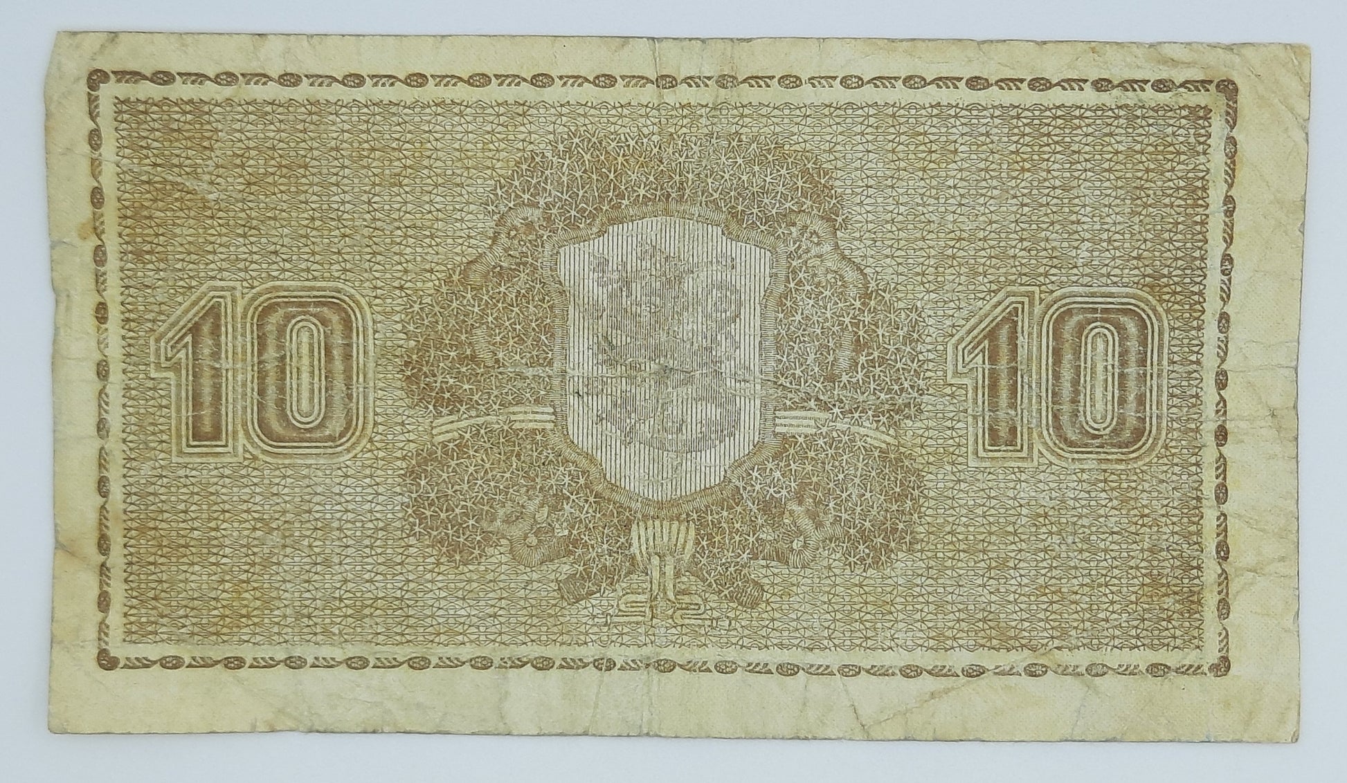 1939 Finland, Suomen Pankki - 10 (Ten) Finnish Markkaa / Marks Banknote Serial No. C 8803340 P-70a