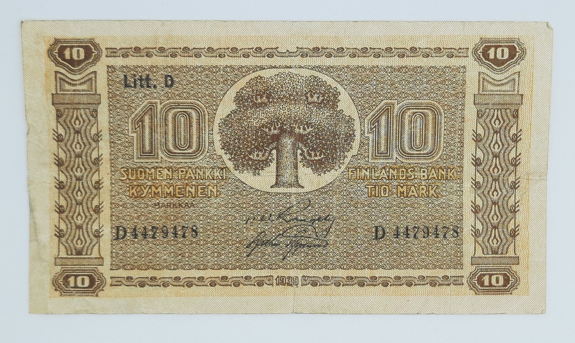 1939 Finland, Suomen Pankki - 10 (Ten) Finnish Markkaa / Marks Banknote Serial No. D 4479478 P-70a