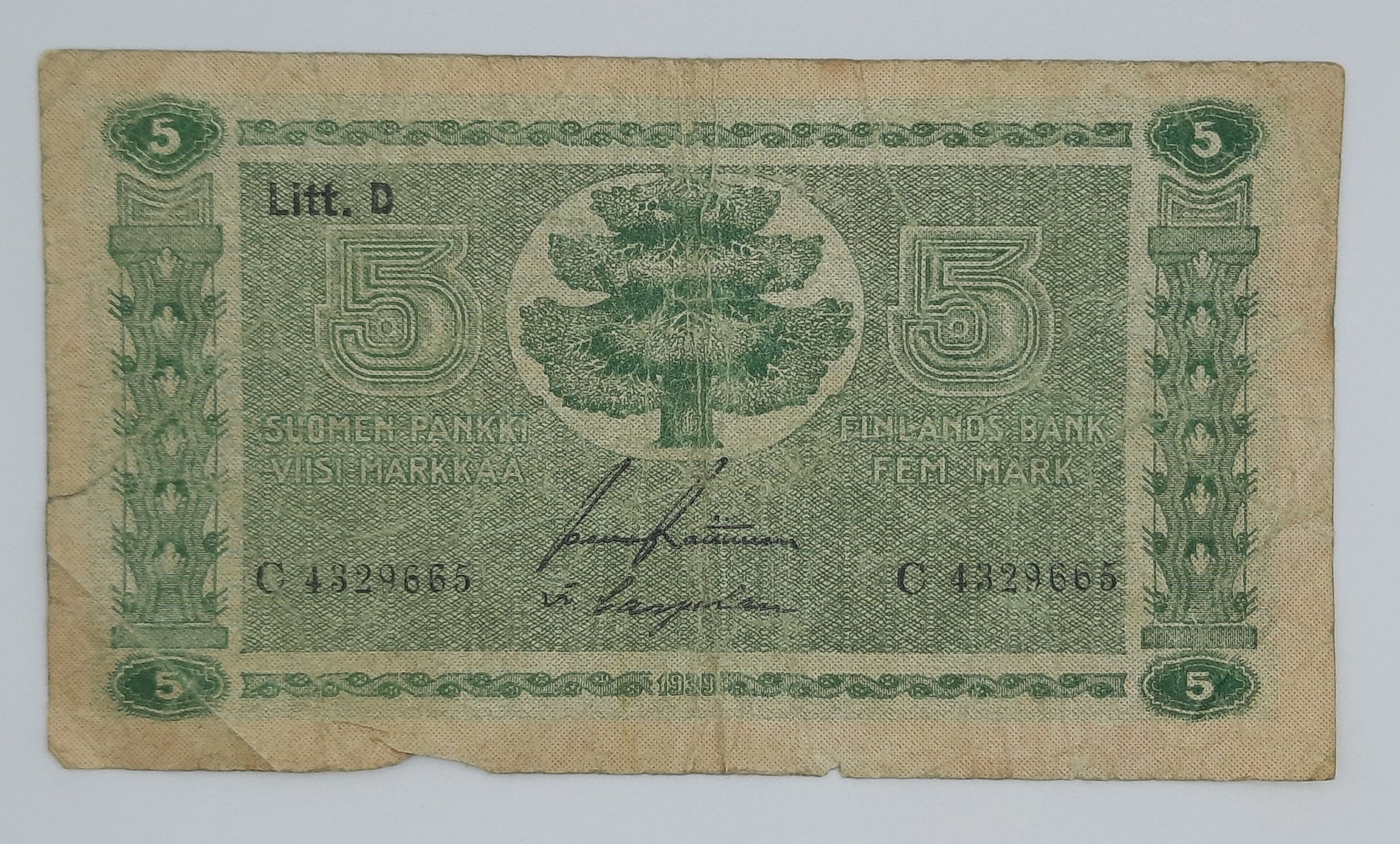 🇫🇮 Finland – 5 Markkaa – 1939 – Litt. D