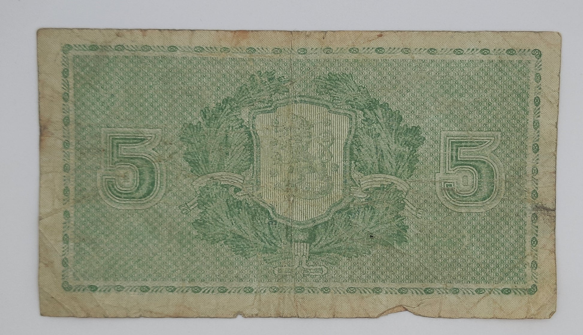1939 Finland, Suomen Pankki - 5 (Five) Finnish Markkaa / Marks Banknote Serial No. C 4329665 P-69a