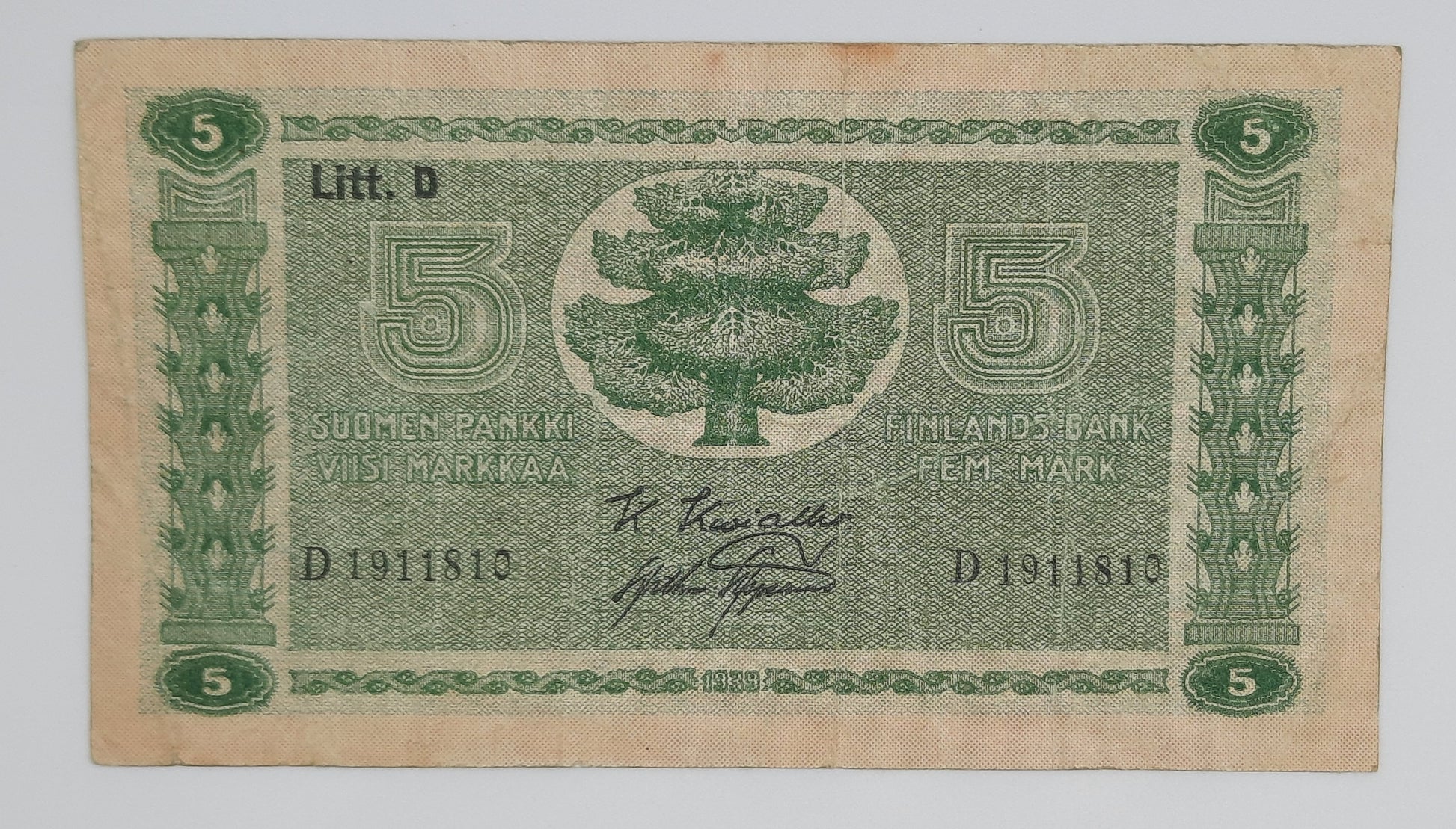 🇫🇮 Finland – 5 Markkaa – 1939 – Litt. D