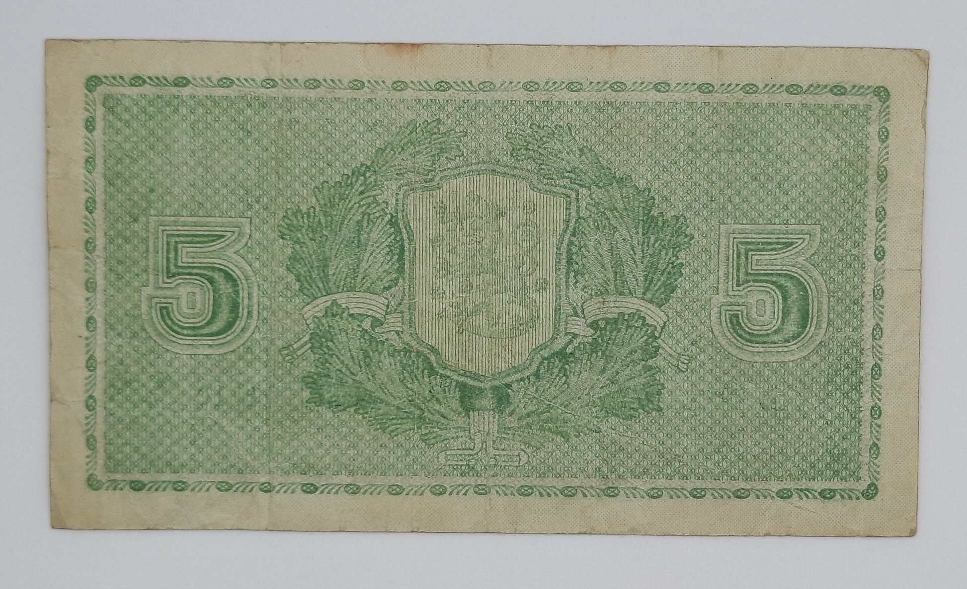 Displays the Finnish lion coat of arms at center, flanked by the numeral “5” on both sides.