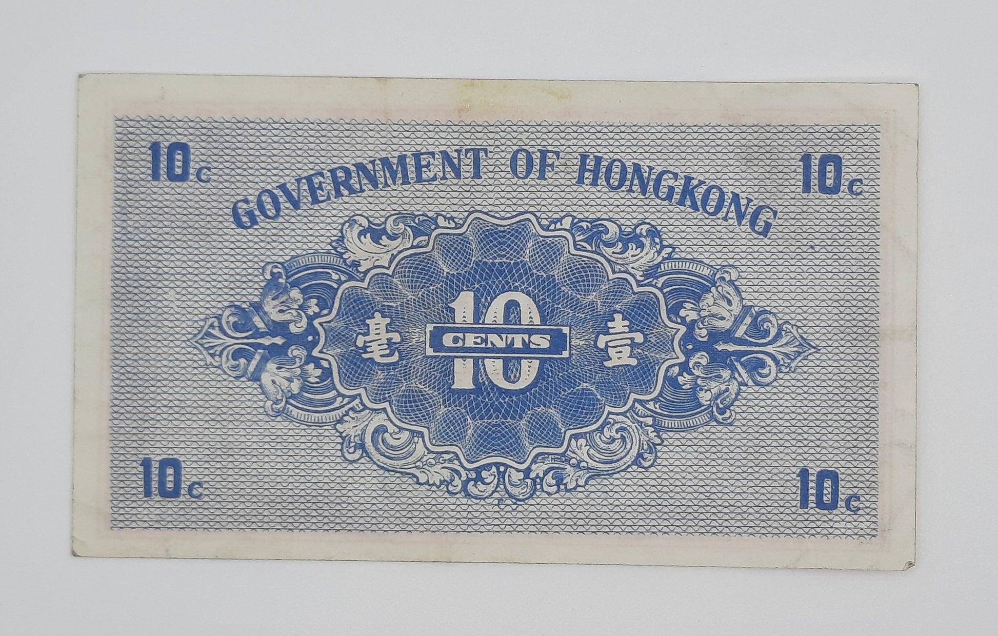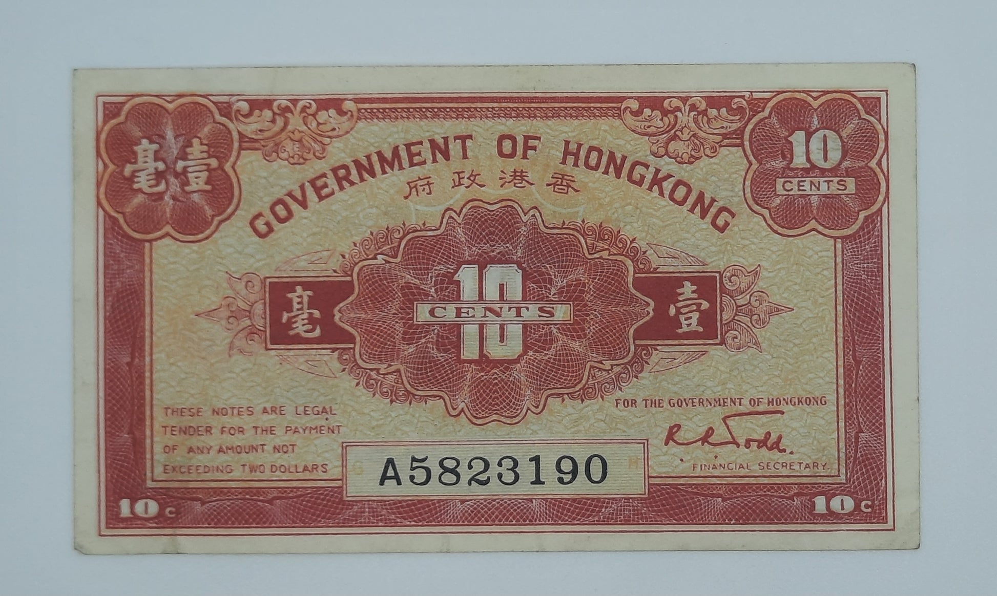 1941 Government of Hongkong - 10 (Ten) Hongkong Cents HKD Banknote Serial No. A 5823190 P-315b