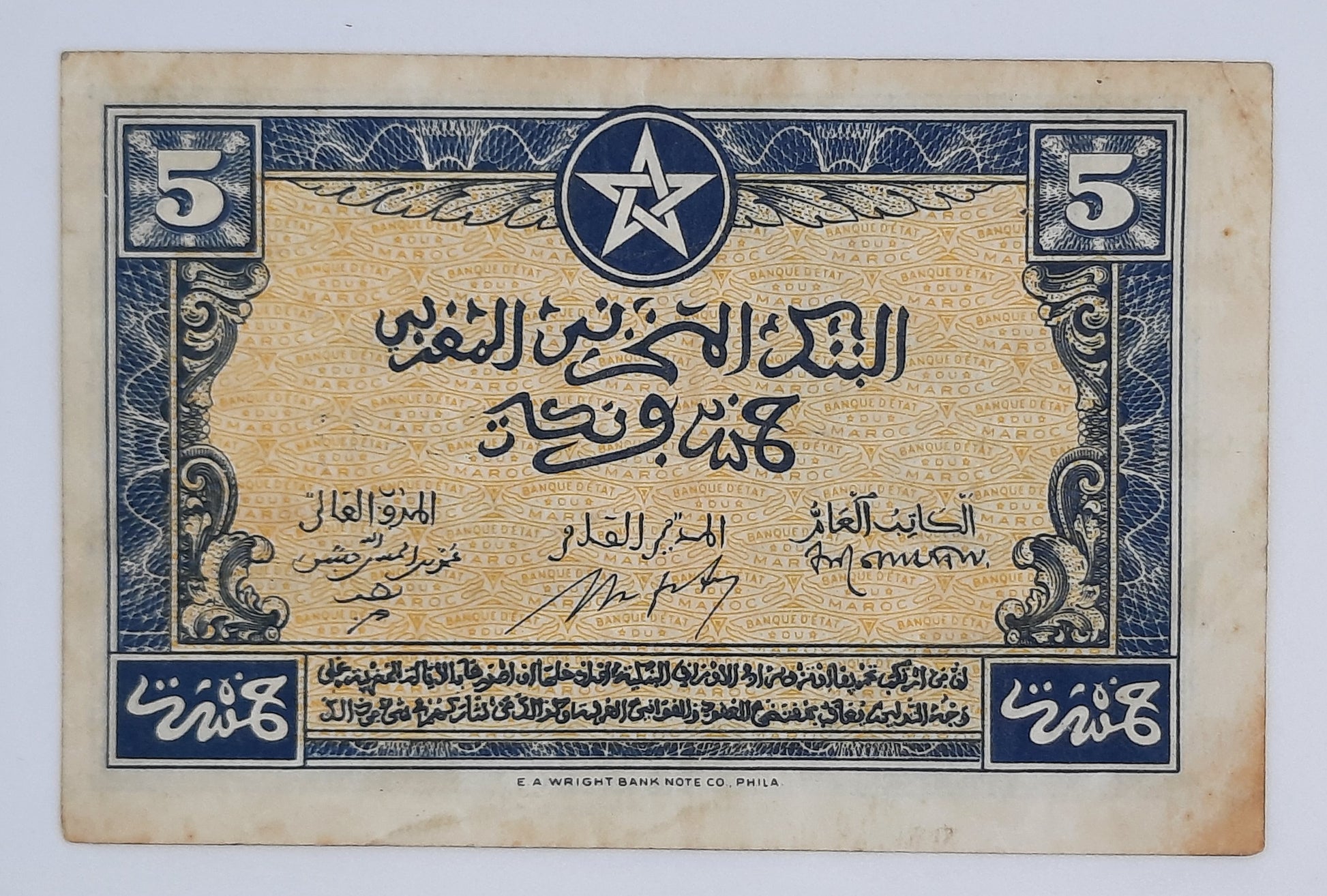 Latin script: "BANQUE D'ÉTAT DU MAROC CINQ FRANCS"