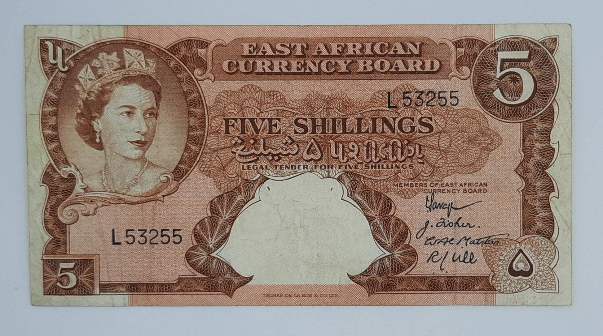 1958 East African Currency Board - 5 (Five) Shillings Banknote Serial NO. L 53255 P-37 Queen Elizabeth II