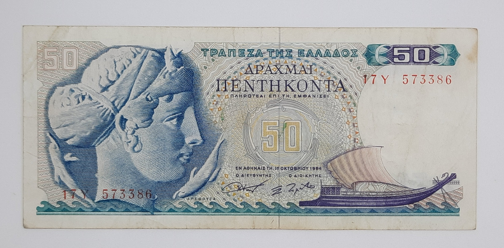 1964 Central Bank of Greece - 50 (Fifty) Greek Drachmas Banknote Serial No. 17Y 573386 P-195