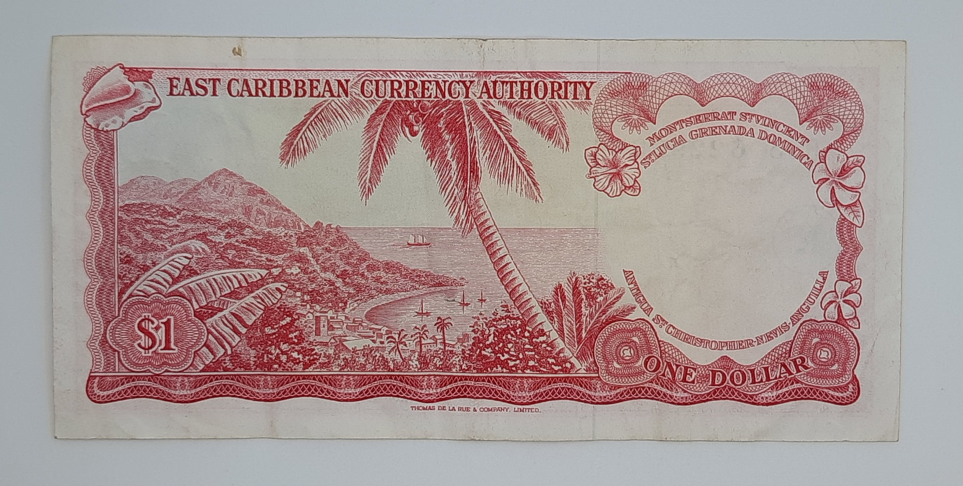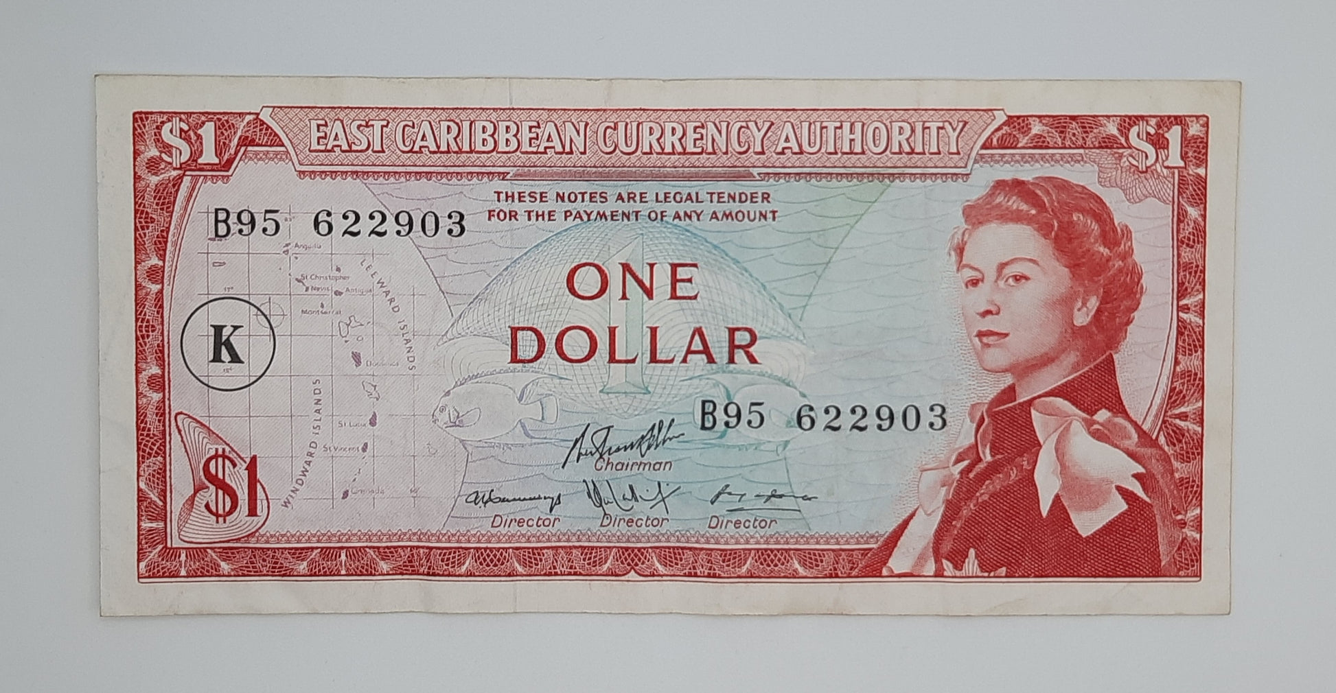 Issued by the East Caribbean Currency Authority, this 1965 $1 banknote represents a key chapter in the monetary unification of the Eastern Caribbean. Printed by Thomas De La Rue Ltd., it features the distinctive “K” overprint, denoting its circulation in St. Kitts — one of several island-specific variants in the ECCA’s first regional series.