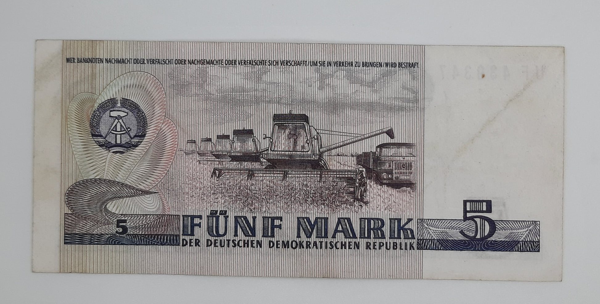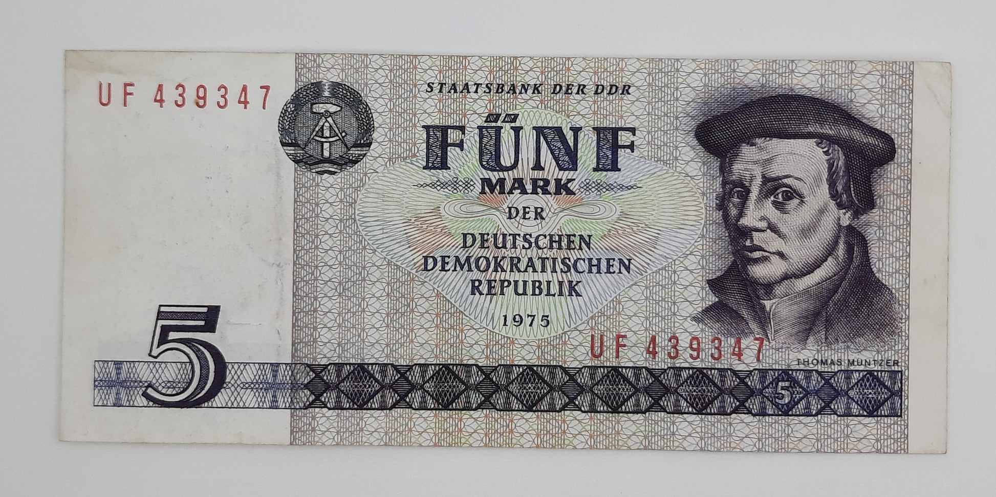 1975 East Germany GDR, Deutsche Notenbank der DDR - 5 Ostmark German Mark Banknote P-24f Serial No. UF 438347