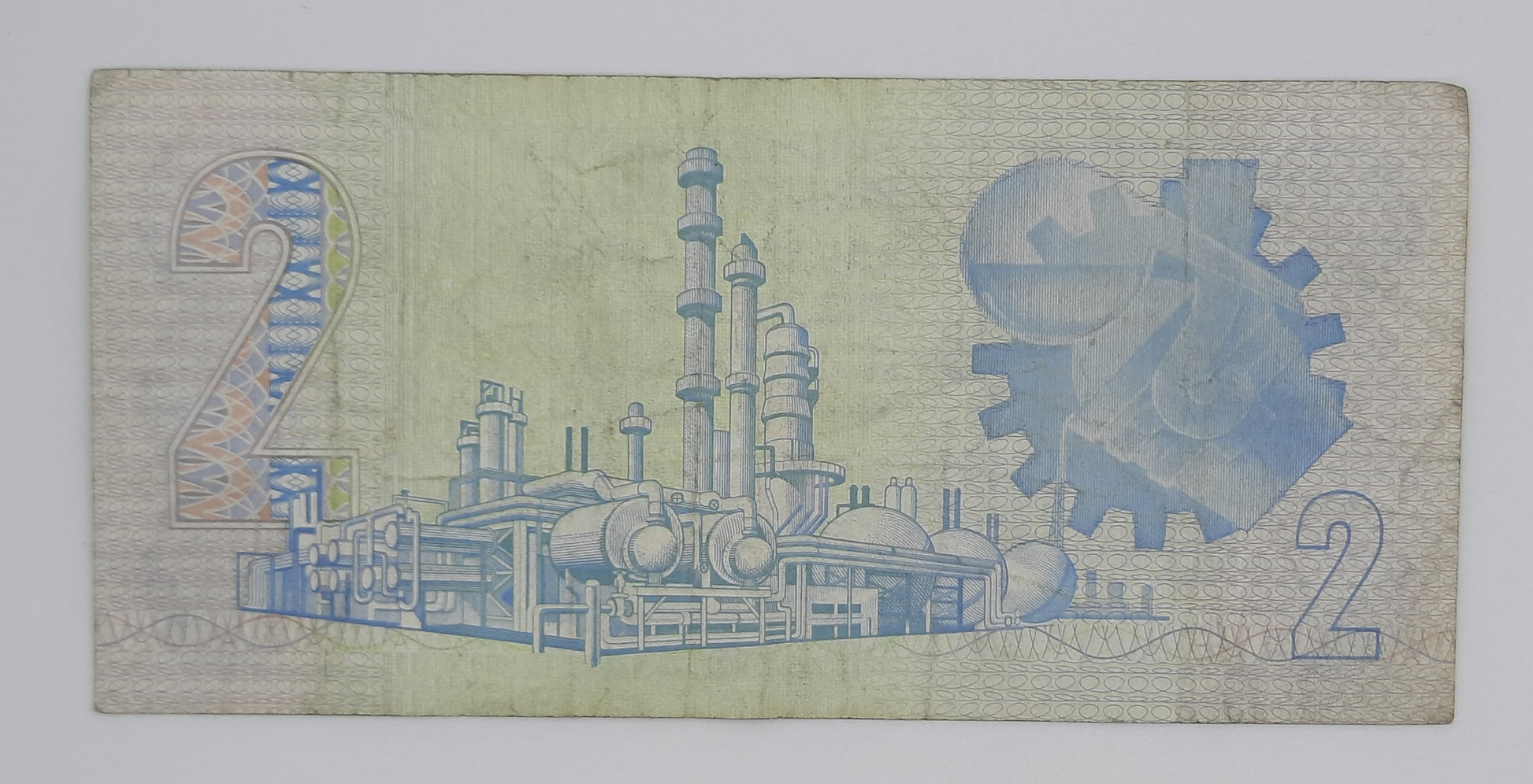 Issued by the South African Reserve Bank, this 2 Rand note was part of the 1978-1990 series, a period that saw South Africa refining its banknote designs with enhanced security features. The note features Jan van Riebeeck, a key historical figure in South African history, alongside a petrochemical refinery, symbolizing the nation’s industrial advancements.
