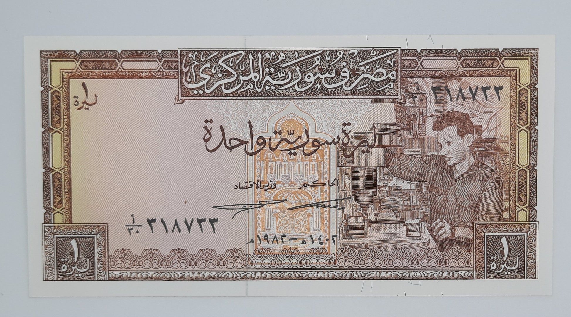 The front of the note includes the official statement: "مصرف سورية المركزي – ليرة سورية واحدة" (Central Bank of Syria – One Syrian Pound)