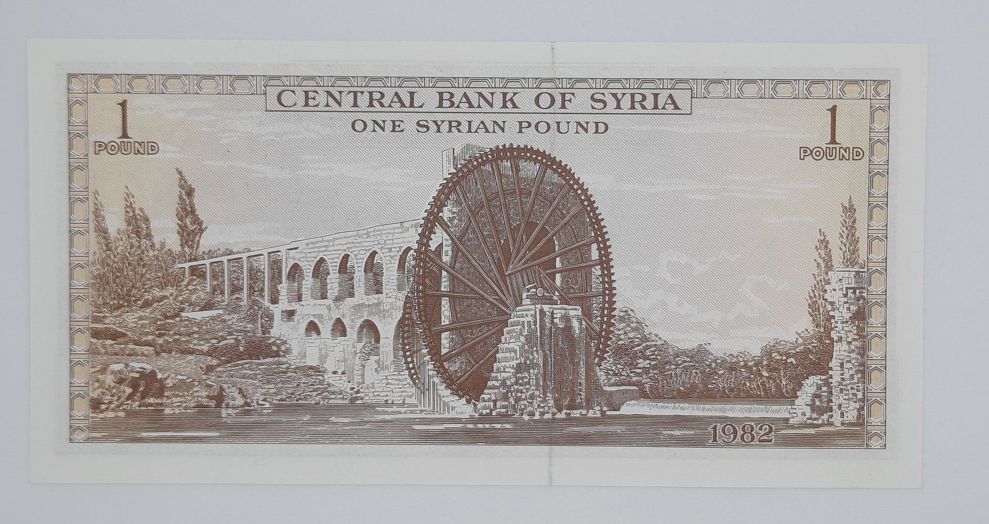Discover the 1982 Syria 1 Pound banknote (P-93e), a beautifully designed note celebrating Syrian industrial progress and the historic waterwheels of Hama.
