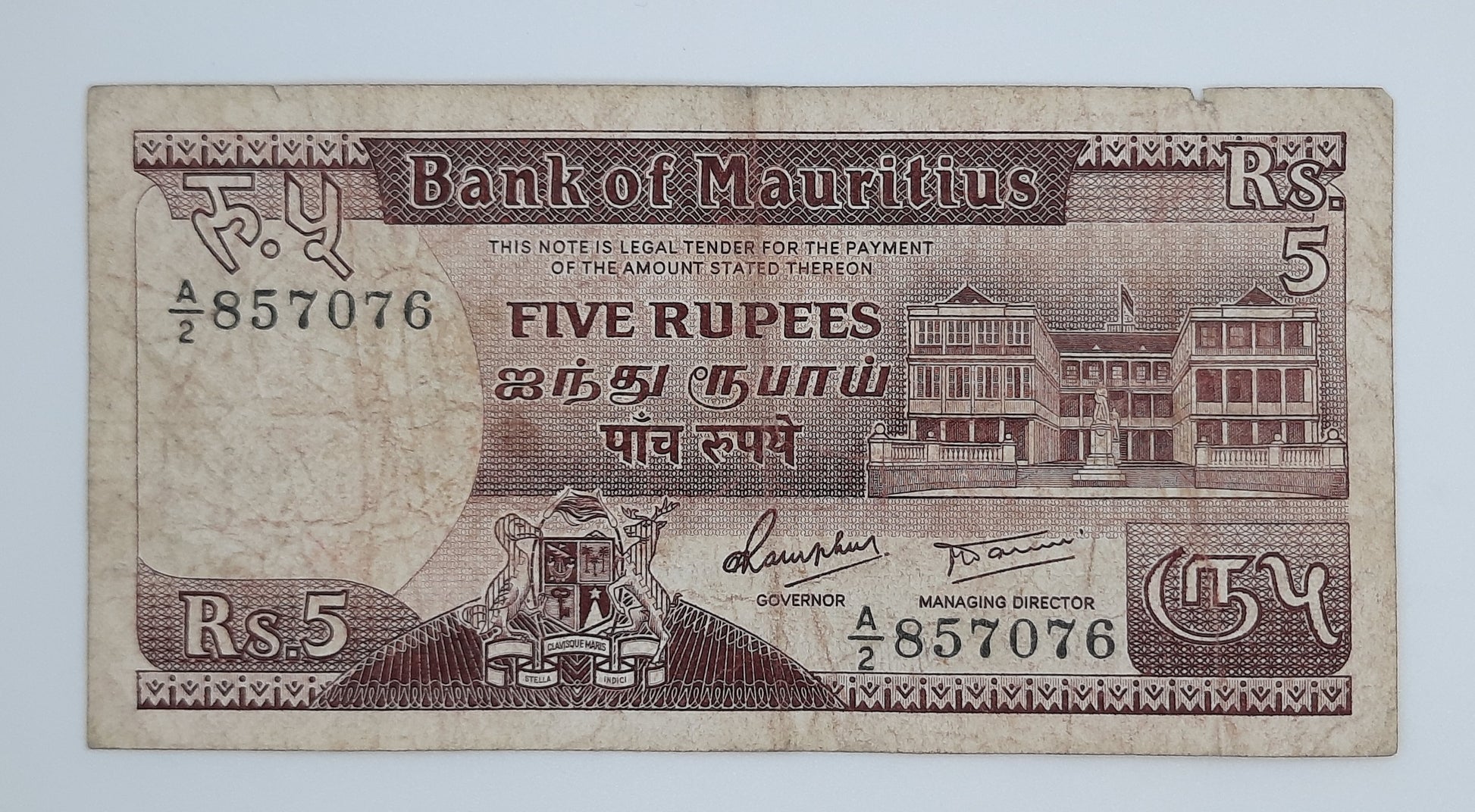 1985 Bank of Mauritius - 5 (Five) Rupees Banknote P-34 Serial No. A2 857076