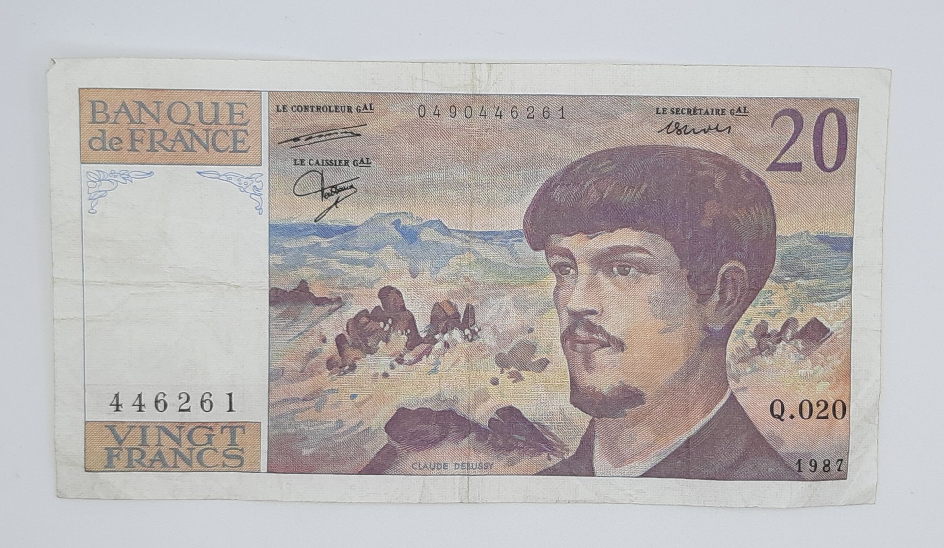 Explore the 1987 France 20 Francs note (P-151b), a beautifully designed banknote celebrating the legacy of Claude Debussy, one of France’s most influential composers.