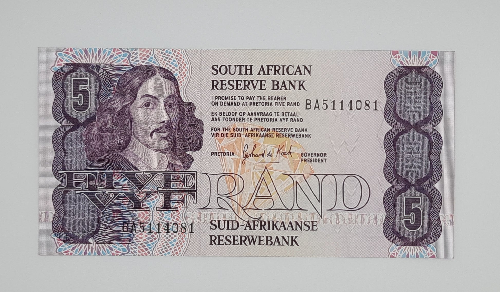 Issued by the South African Reserve Bank, the 1990 5 Rand note captures a pivotal moment in South Africa’s monetary and cultural history. As part of the 1973–1990 series, this note features Jan van Riebeeck, the Dutch colonial administrator often regarded as the founder of Cape Town. His portrait, paired with vibrant guilloche patterns and bilingual inscriptions, reflects the complex legacy of South Africa’s evolving identity.