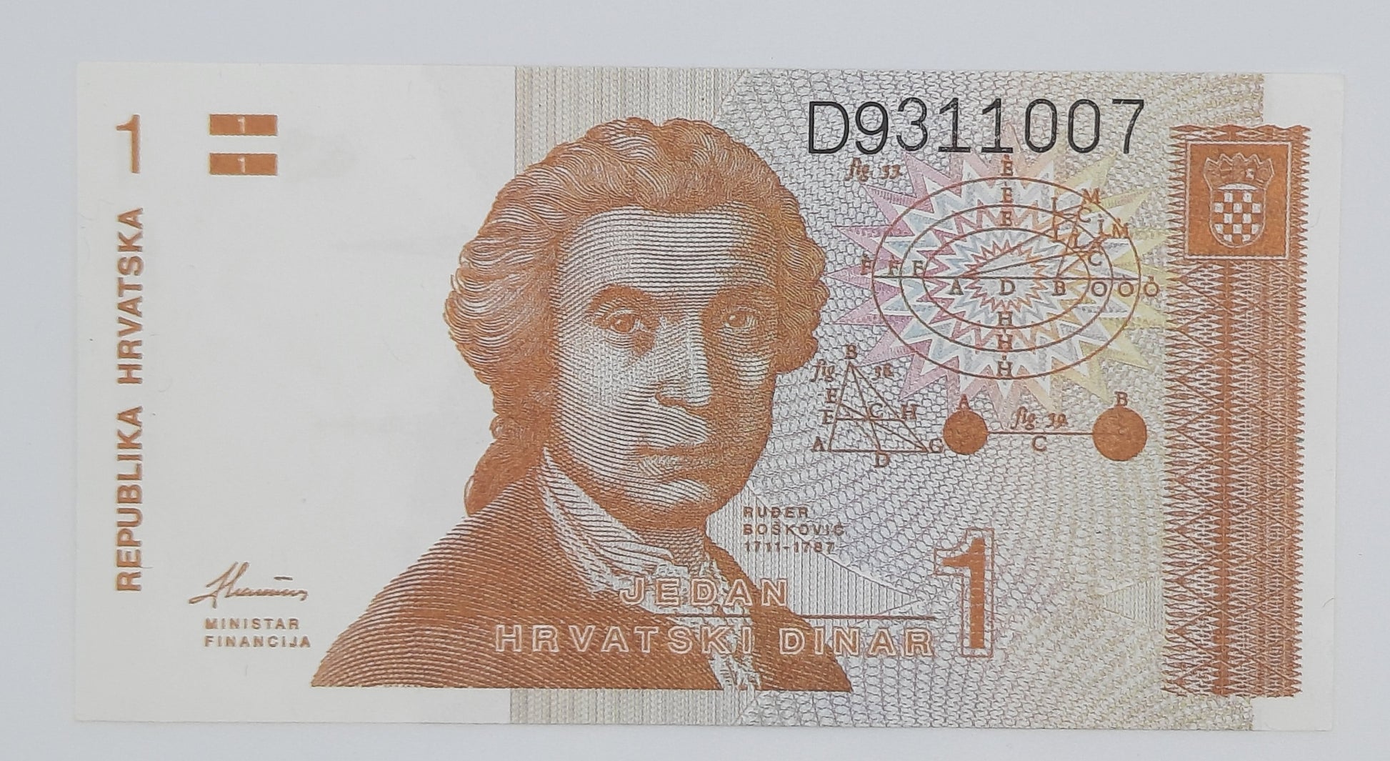Front: A portrait of Ruđer Bošković, a renowned Croatian mathematician, physicist, and astronomer, alongside geometric calculations.