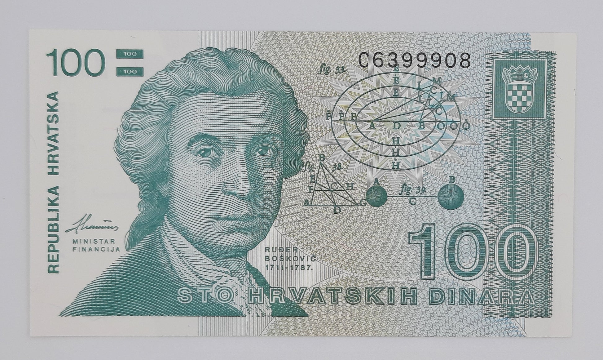 Front: A portrait of Ruđer Bošković, a renowned Croatian mathematician, physicist, and astronomer, alongside geometric calculations.