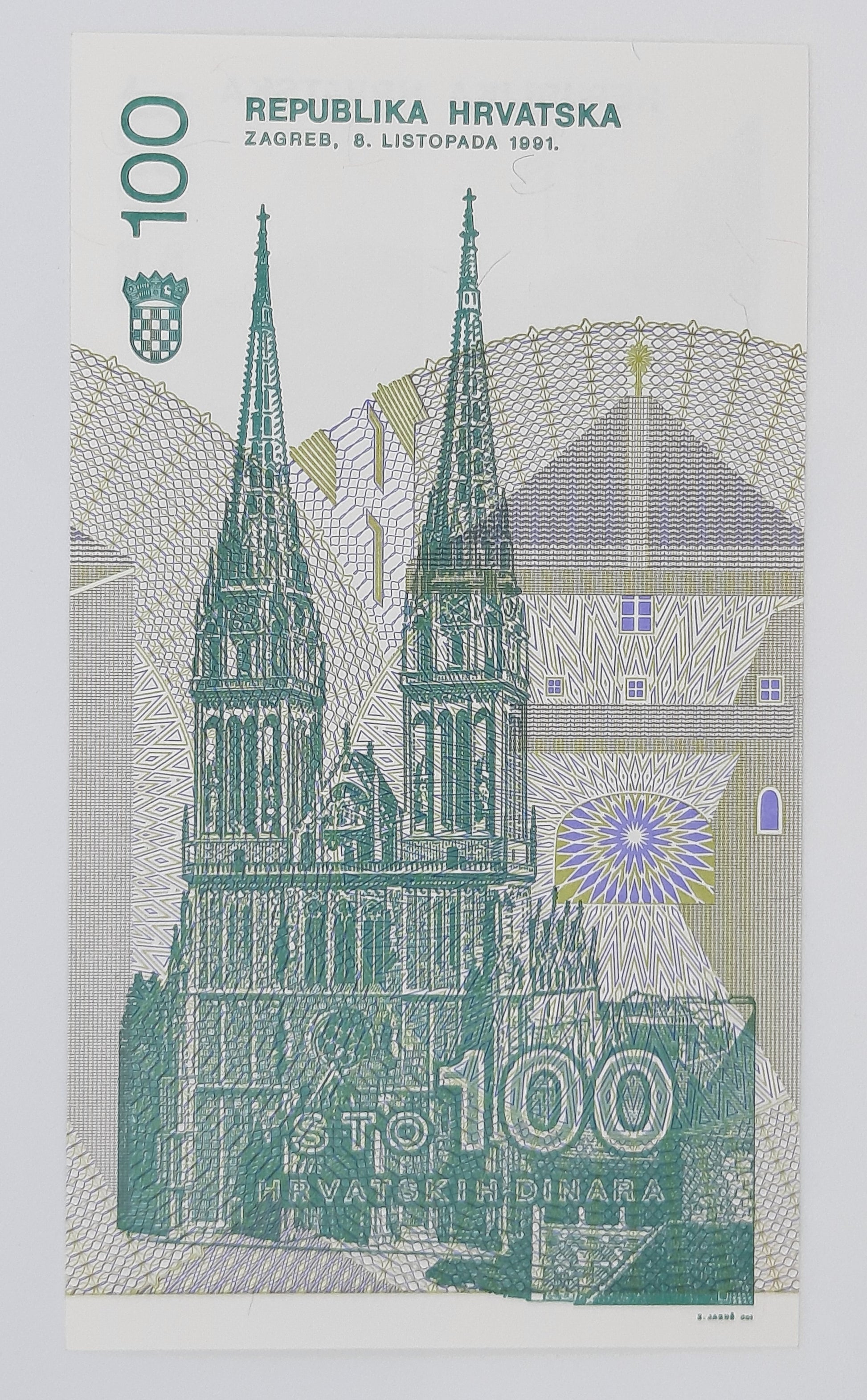 Issued by the National Bank of Croatia, this 100 Dinar note was part of Croatia’s first currency series following its independence from Yugoslavia. The Croatian Dinar was a temporary currency used from 1991 to 1994, before being replaced by the Kuna.
