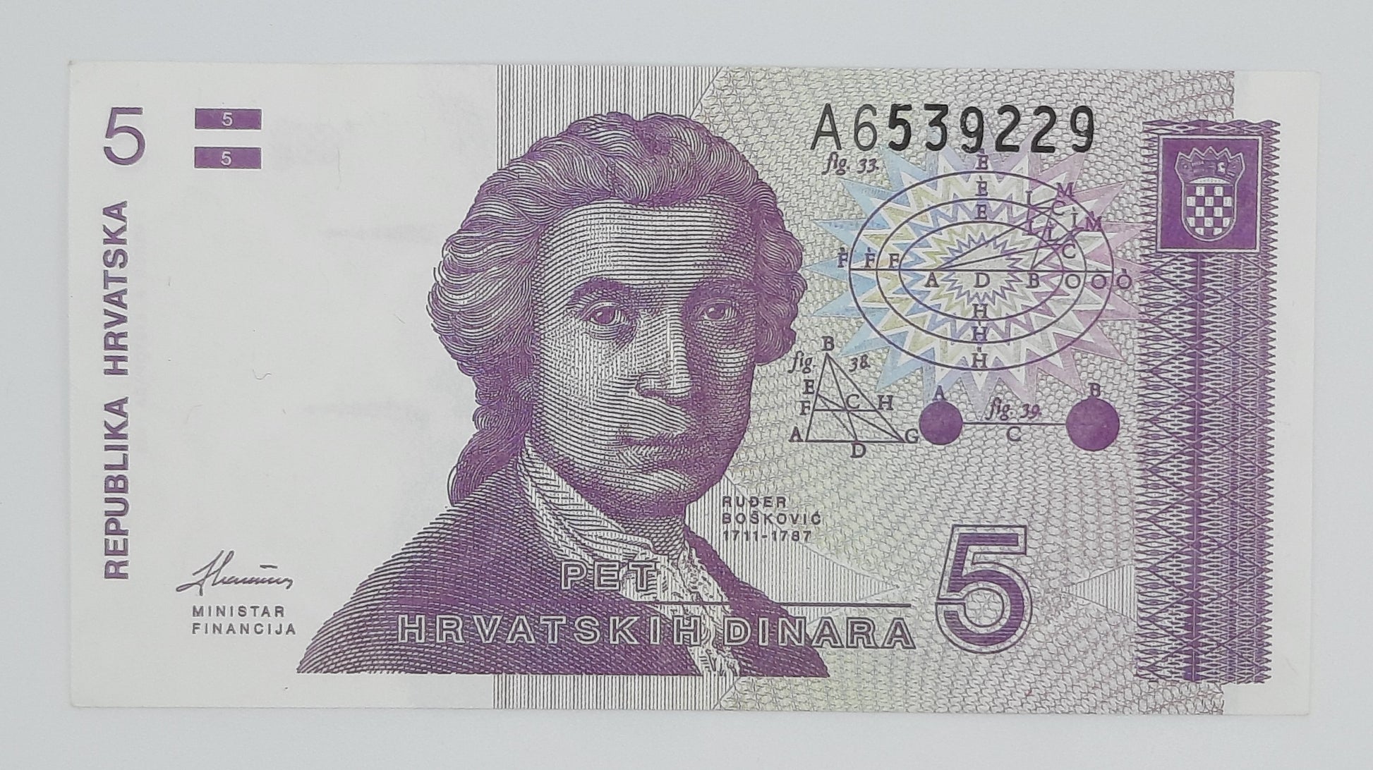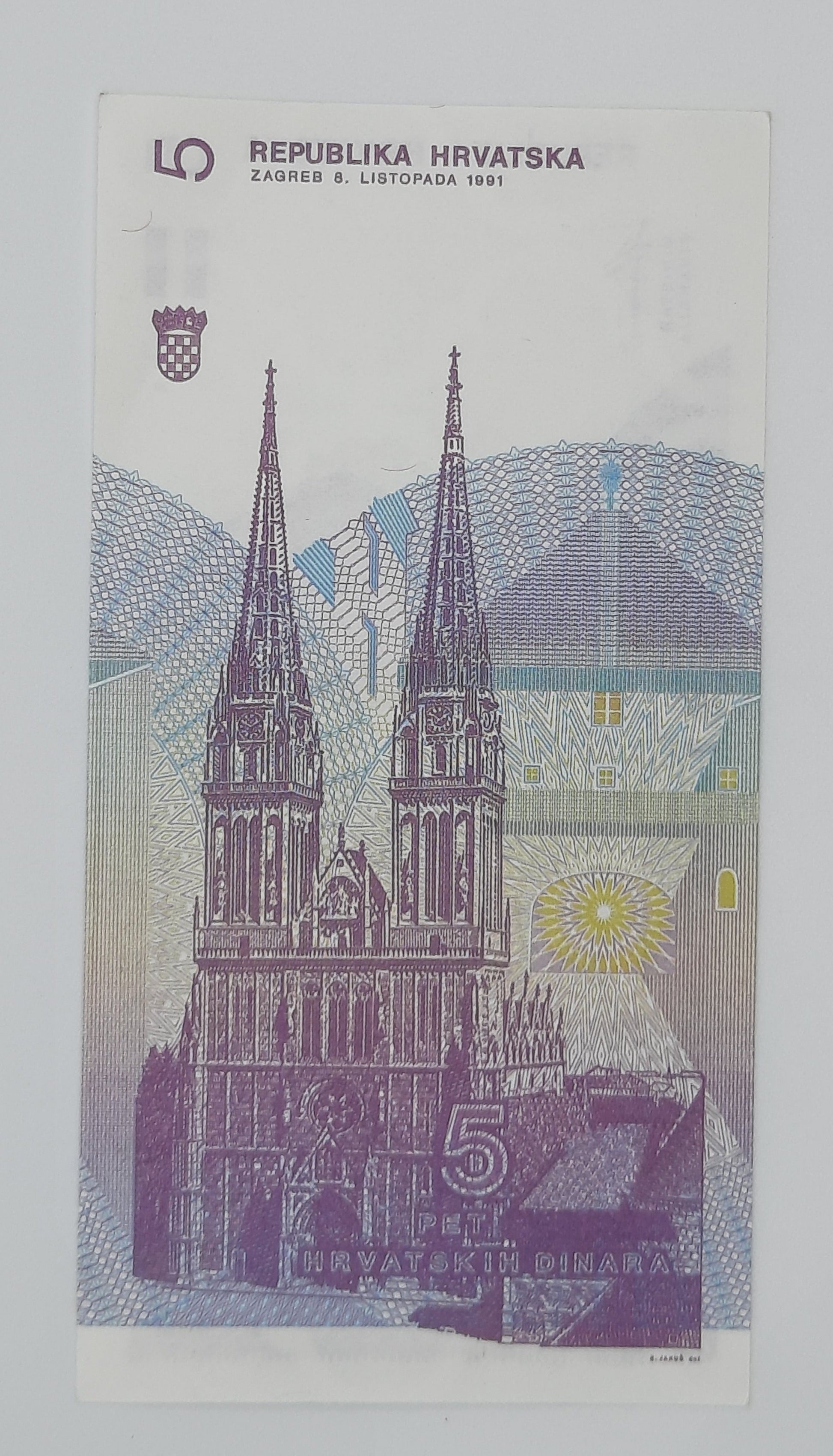 Explore the 1991 Croatia 5 Dinar note (P-17), a fascinating piece from Croatia’s early post-independence monetary system.