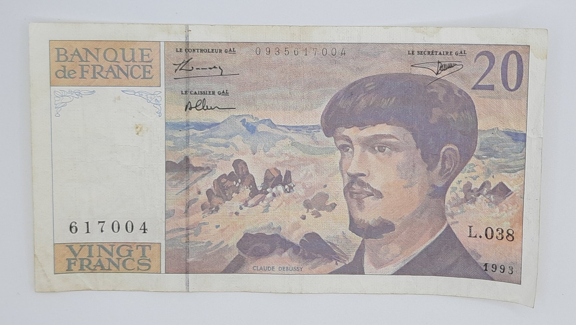 Explore the 1993 France 20 Francs note (P-151g), a beautifully designed banknote celebrating the legacy of Claude Debussy, one of France’s most influential composers.
