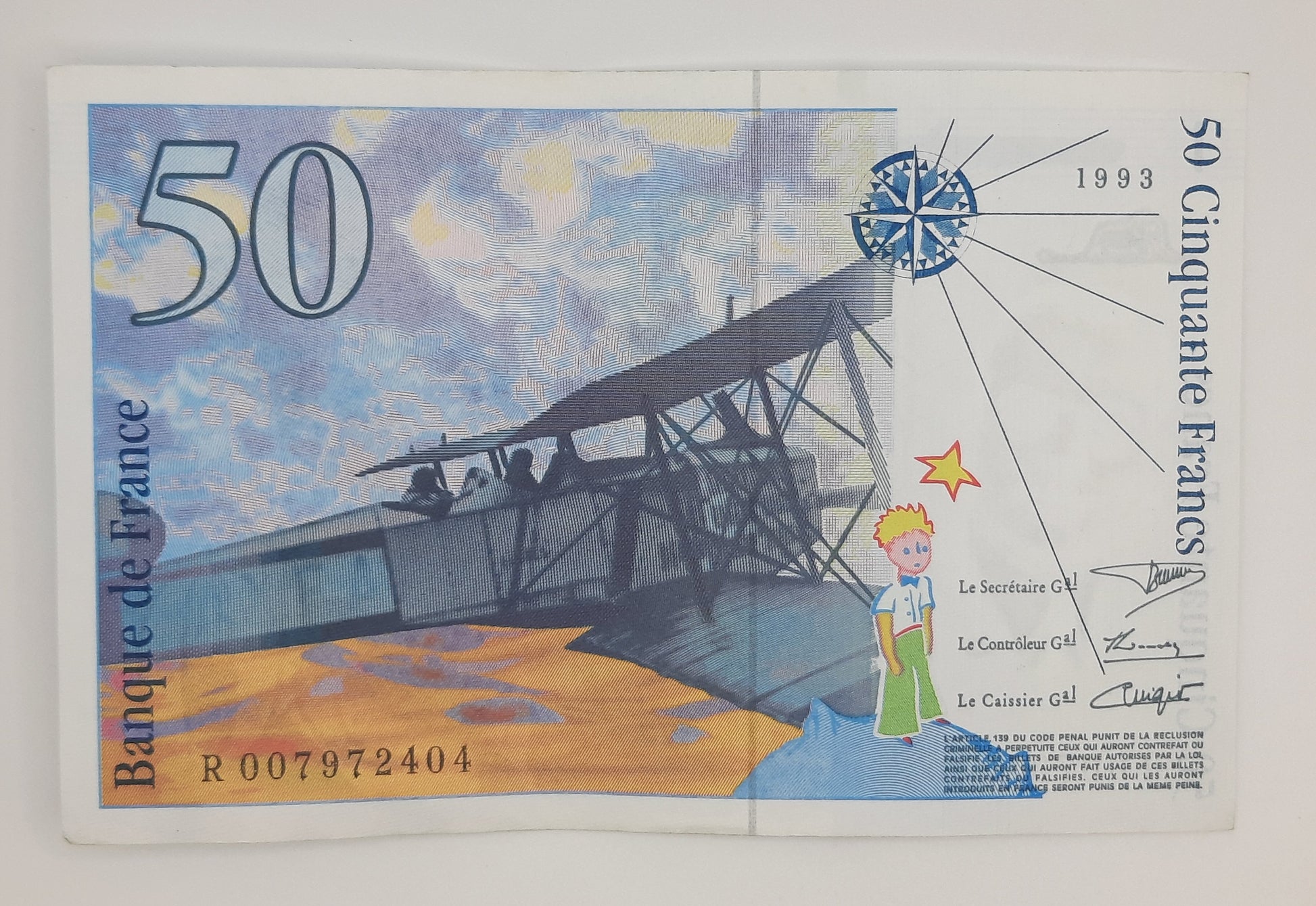 Explore the 1993 France 50 Francs banknote (P-157), celebrating the legacy of Antoine de Saint-Exupéry, the pioneering aviator and beloved author of Le Petit Prince.