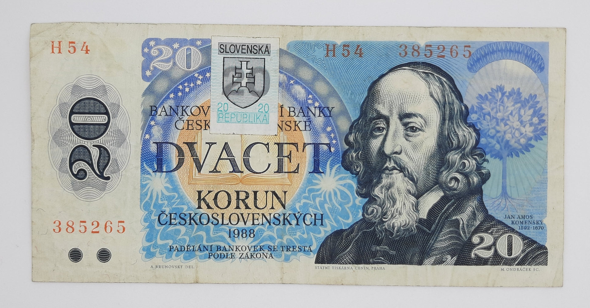 Front: Features Jan Ámos Komenský, a Czech philosopher and educator, retained from the original Czechoslovak design. The green Slovak overprint includes the Slovak national shield and the denomination "20".