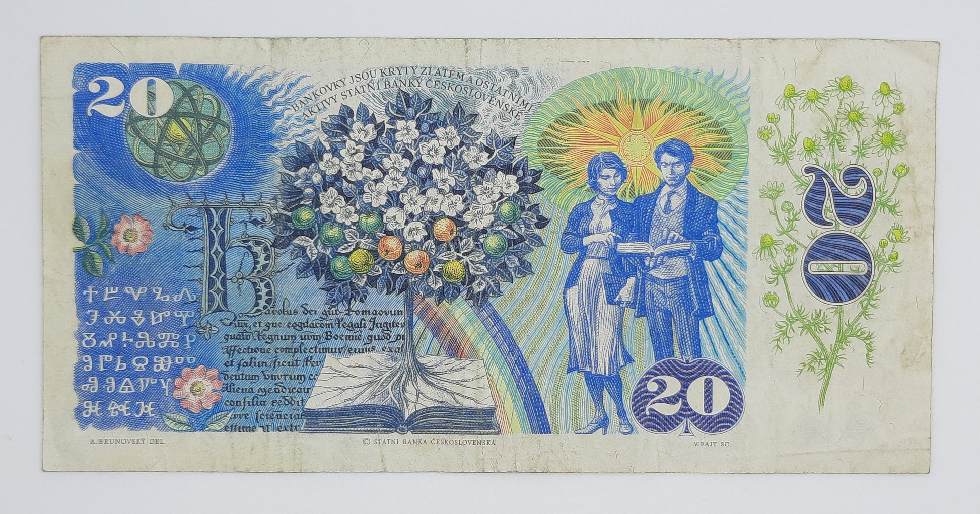 The front of the note includes the original Czechoslovak text: "Bankovka Státní Banky Československé – Dvacet Korun Československých" (State Bank of Czechoslovakia – Twenty Czechoslovak Koruna)