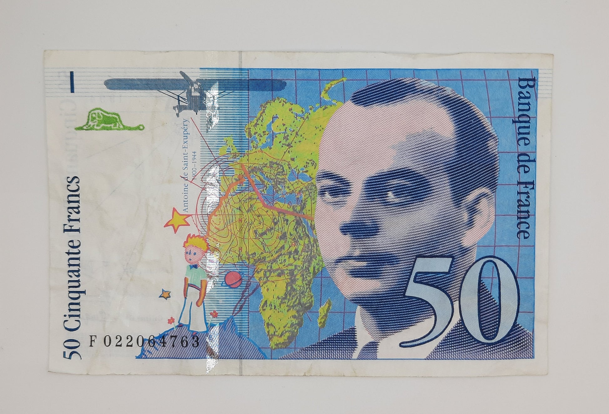 Issued by the Banque de France, the 50 Francs Saint-Exupéry note was introduced in 1992 and remained in circulation until 2002, when France adopted the Euro (EUR). This banknote pays homage to Antoine de Saint-Exupéry, the legendary French pilot and writer of Le Petit Prince.