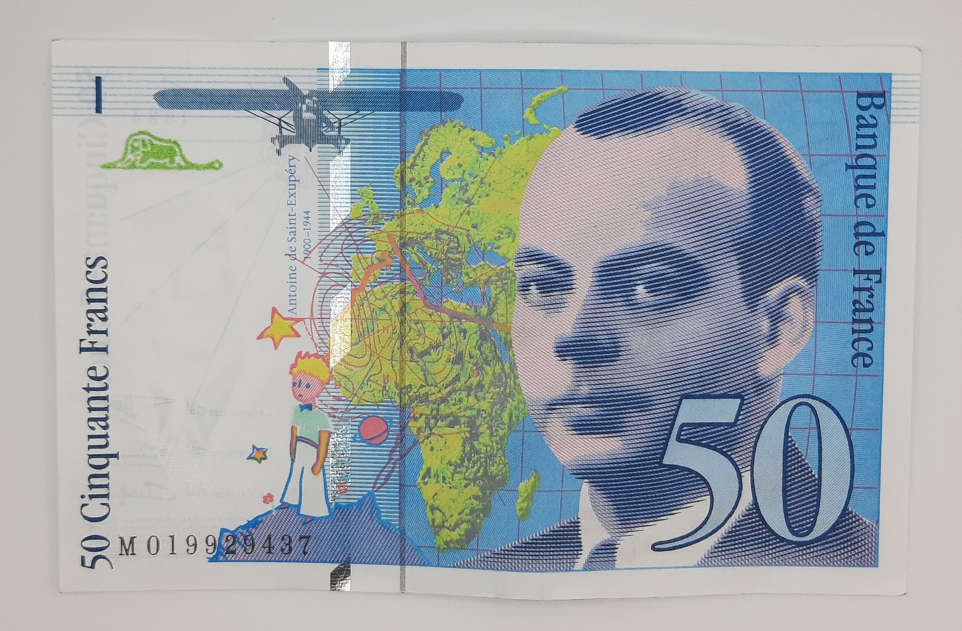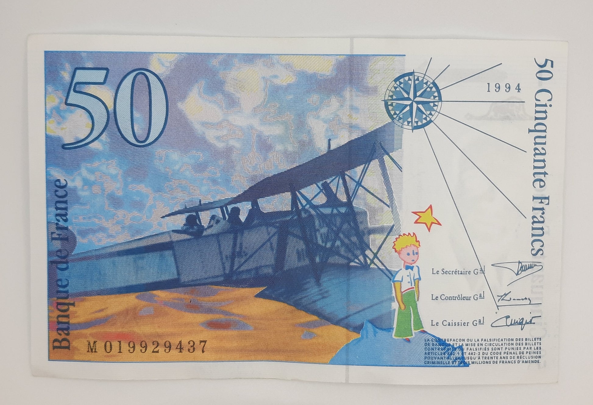 Issued by the Banque de France, the 50 Francs Saint-Exupéry note was introduced in 1992 and remained in circulation until 2002, when France adopted the Euro (EUR). This banknote pays homage to Antoine de Saint-Exupéry, the legendary French pilot and writer of Le Petit Prince.