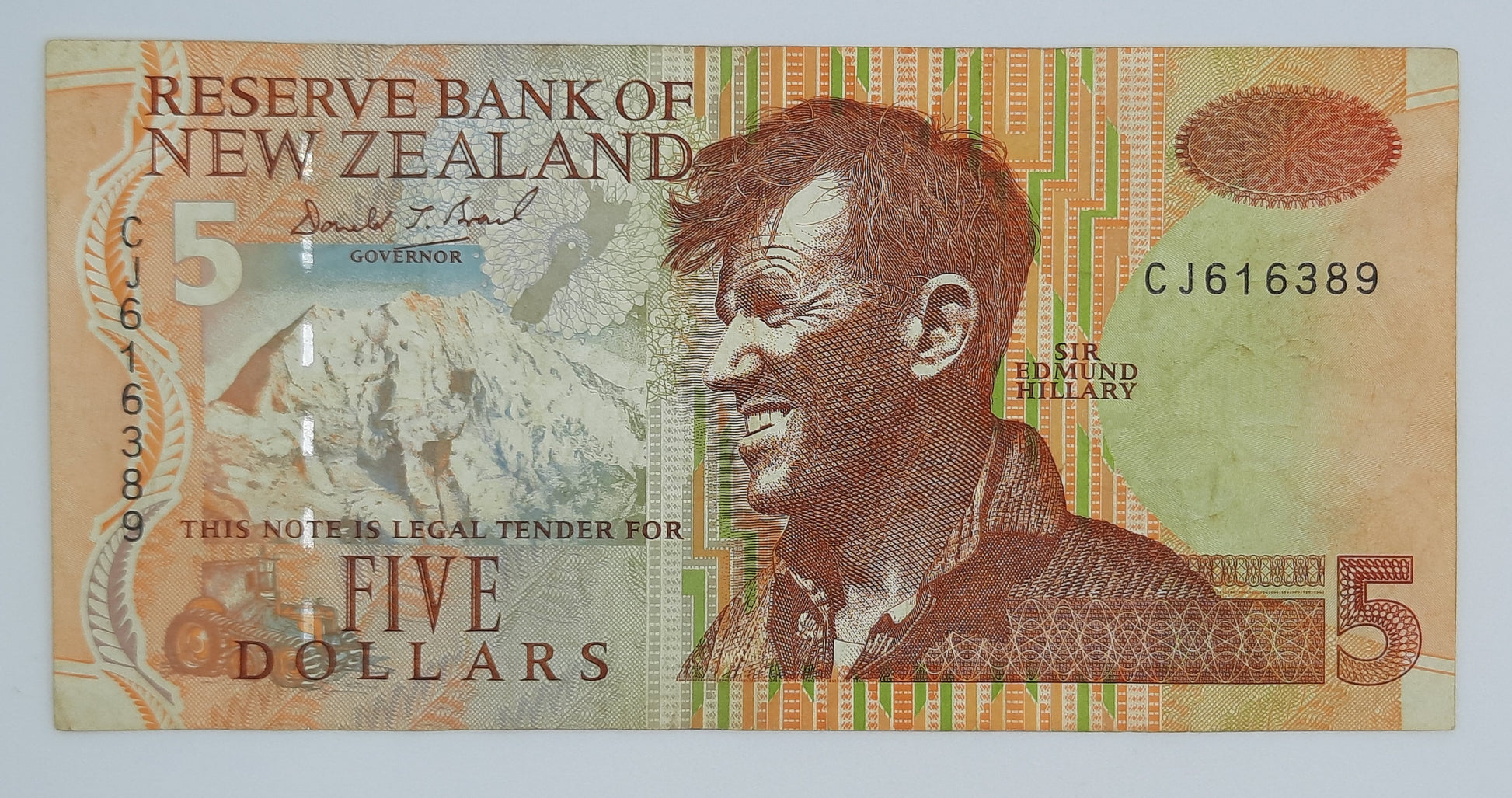 1995 (1992)- Reserve Bank of New Zealand - $5 (Five) NZD Dollars Banknote, Serial No. CJ 616289 P-177b Sir Edmund Hillary & Campbell Island