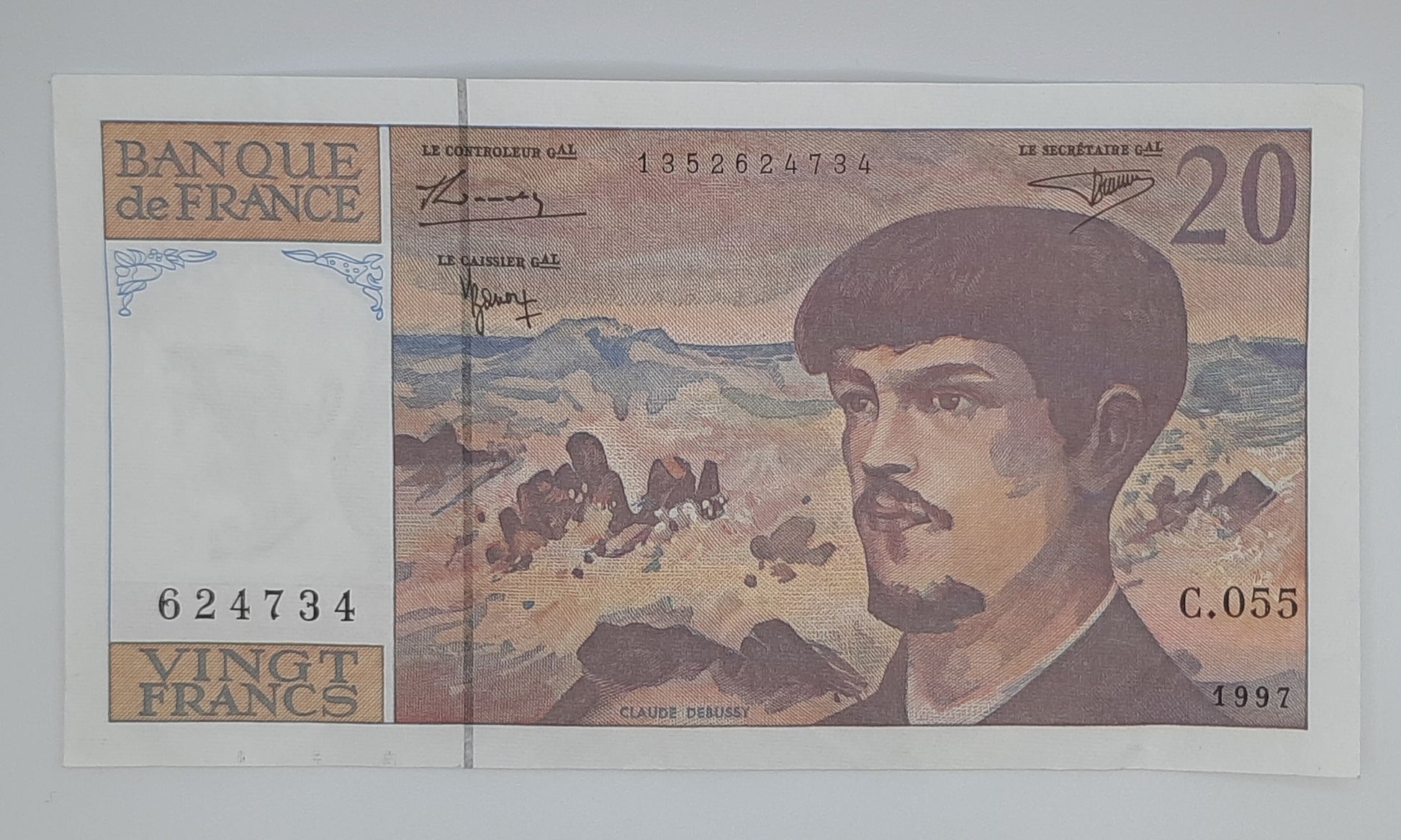 Explore the 1997 France 20 Francs note (P-151i), a beautifully designed banknote celebrating the legacy of Claude Debussy, one of France’s most influential composers.