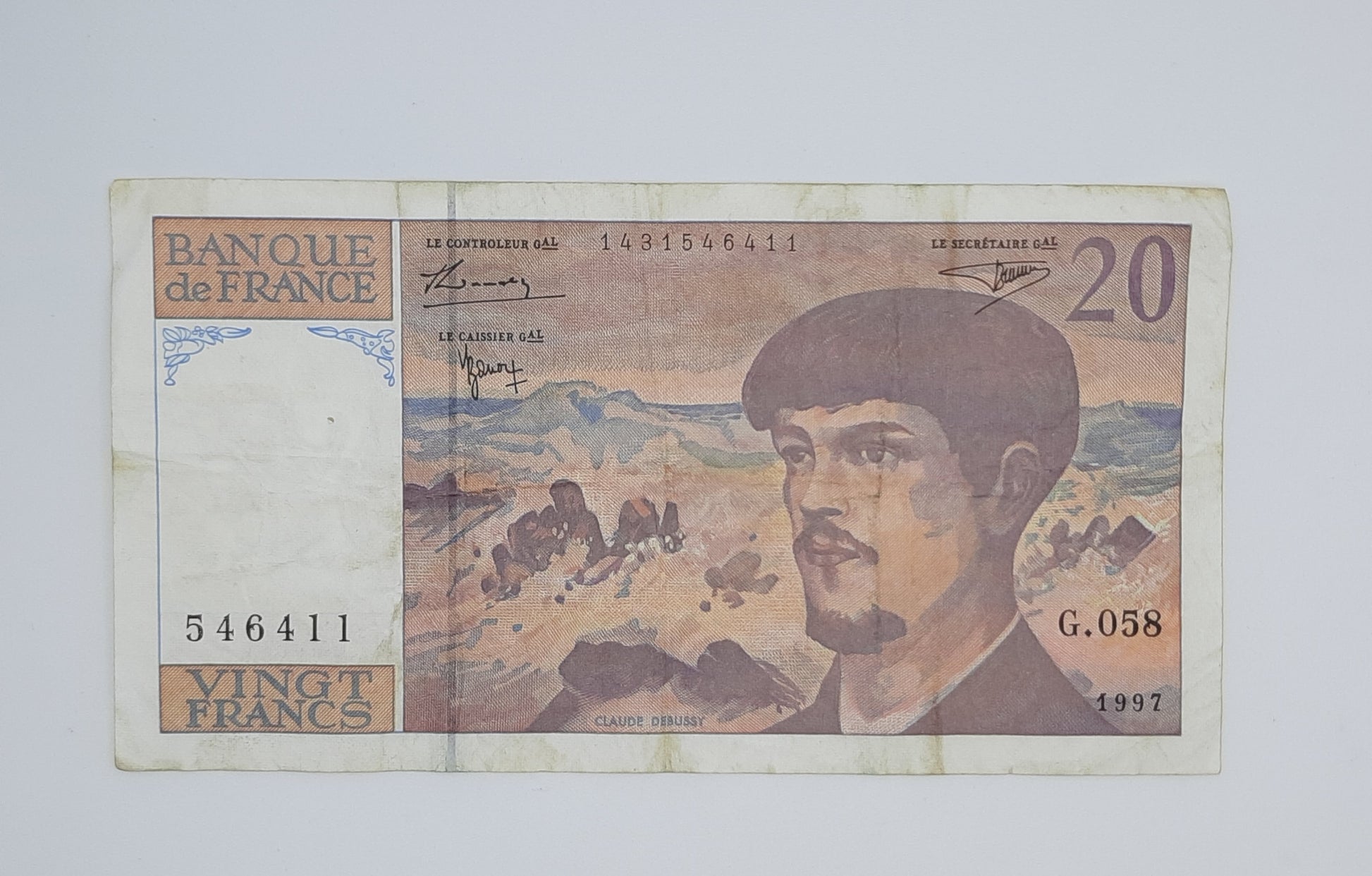 Explore the 1997 France 20 Francs note (P-151i), a beautifully designed banknote celebrating the legacy of Claude Debussy, one of France’s most influential composers.