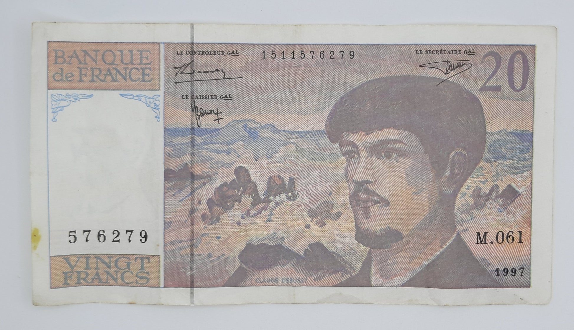 Explore the 1997 France 20 Francs note (P-151i), a beautifully designed banknote celebrating the legacy of Claude Debussy, one of France’s most influential composers.