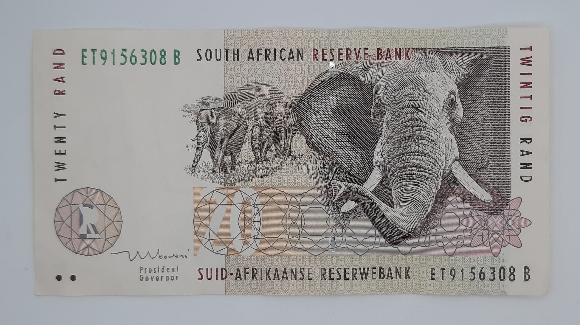 1999 South African Reserve Bank / 20 South African Rand ZAR Banknote Serial No. ET 9156308 B