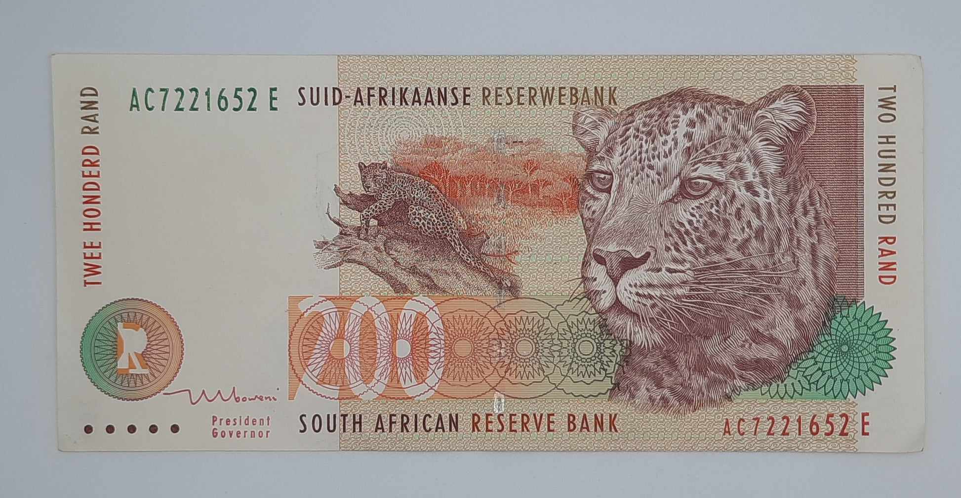 Issued by the South African Reserve Bank, the 1999 200 Rand banknote is part of the high-denomination series introduced in the post-apartheid era. Featuring a powerful leopard and symbols of industrial development, this note reflects South Africa’s economic ambition and natural heritage during a time of national transformation.