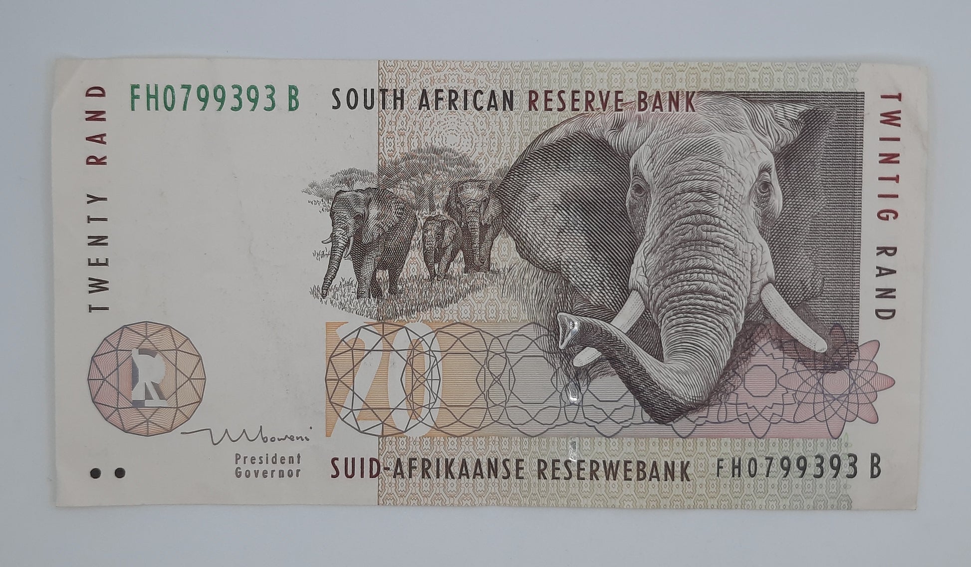 1999 South African Reserve Bank / 20 South African Rand ZAR Banknote Serial No. FH 0799393 B P-124b