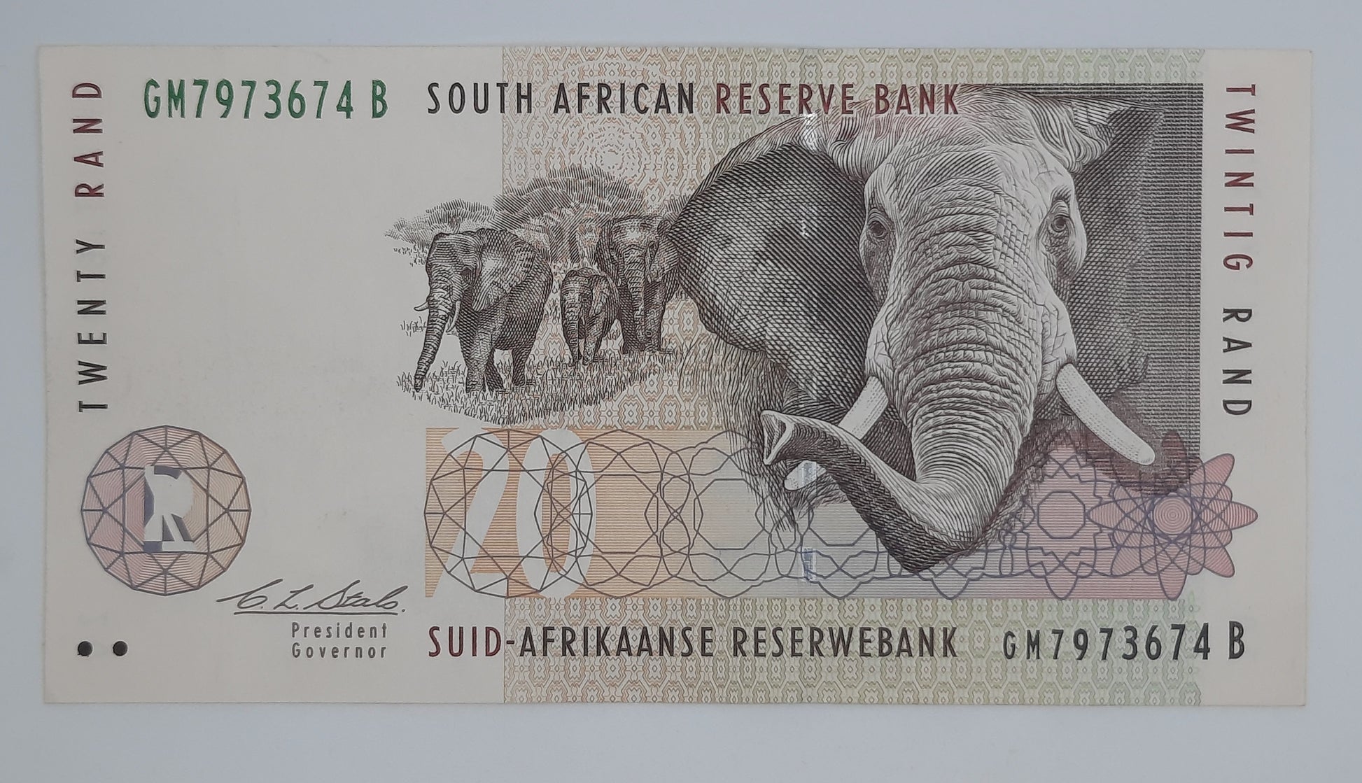 1993 South African Reserve Bank / 20 South African Rand ZAR Banknote Serial No. GM 7973674 B P-124a