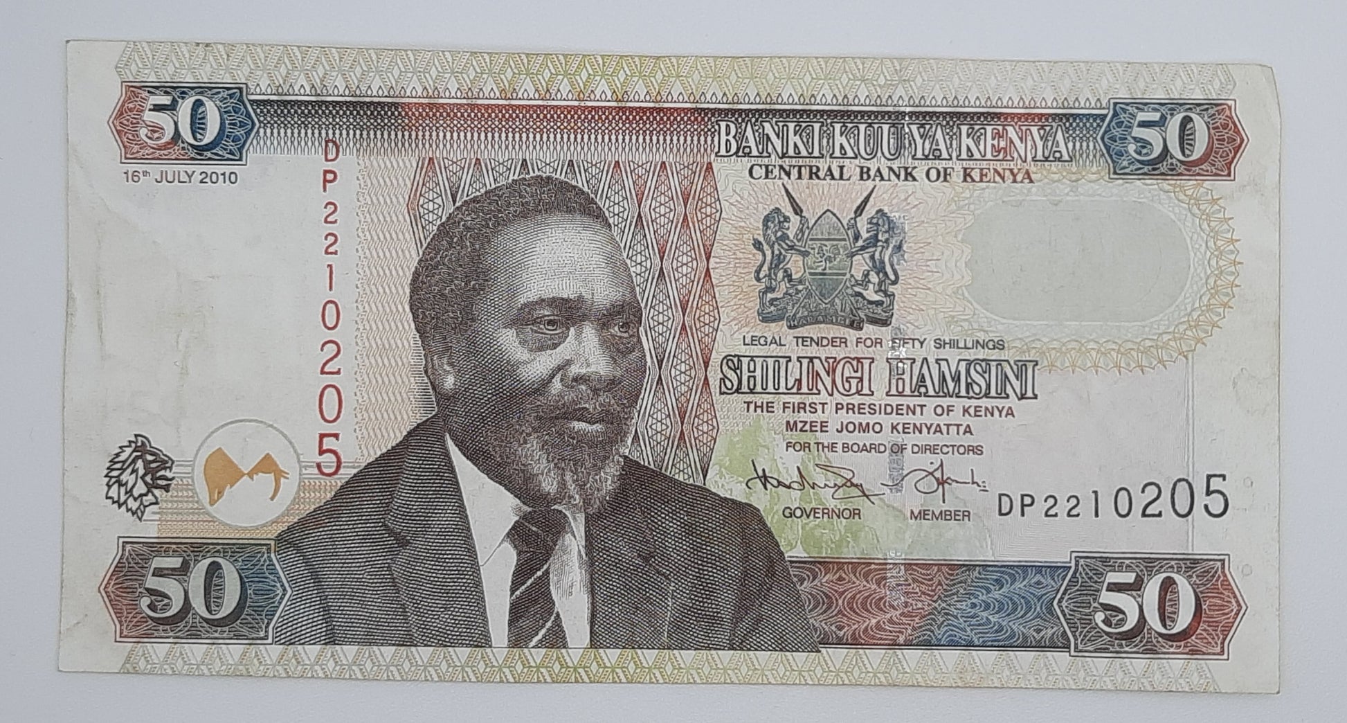 2010 Banki Kuu Ya Kenya - 50 Kenyan Shillings / Shillingi Banknote P-47e Serial No. DP 2210205 Jomo Kenyatta