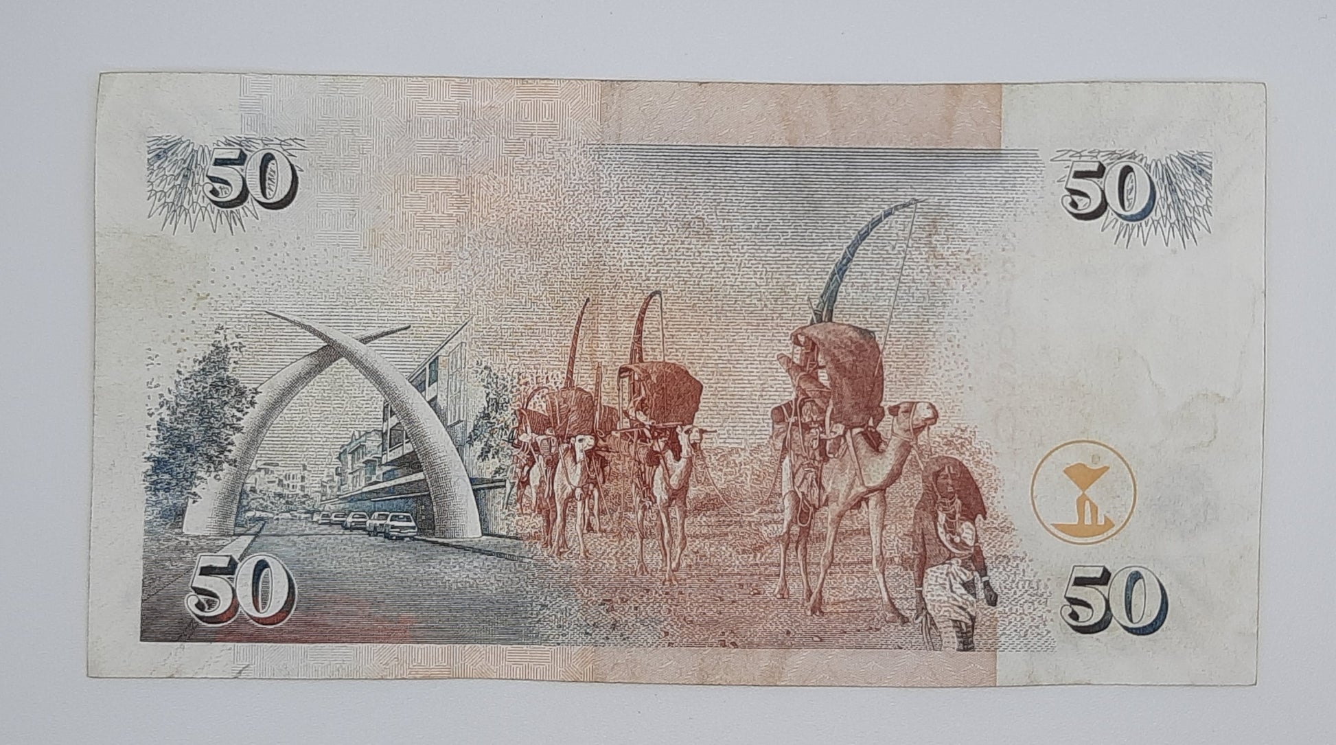 The 50 Shillings note highlights Kenya’s coastal economy, symbolised by the Mombasa tusks and camel caravans—historic markers of trade and cultural exchange.